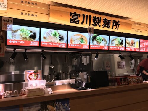 たとえば「富川製麺所」っていう制限エリア内のお店では、味噌バターコーンとか、えび塩ラーメンもあるから、乗継の合間とかにもぴったり!